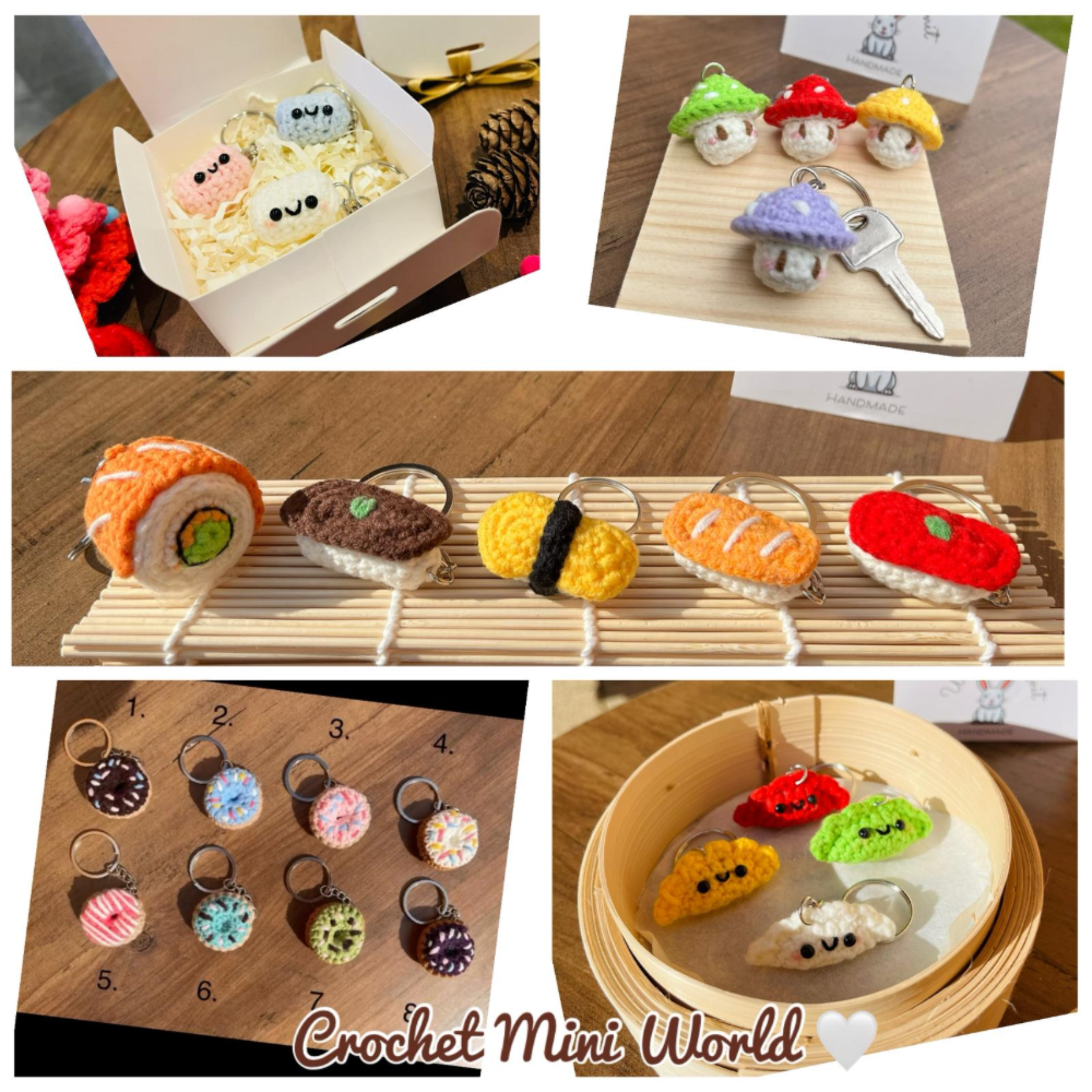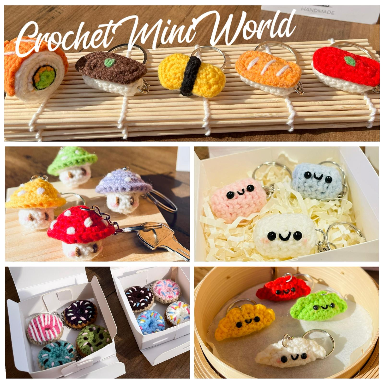 Adorable food-themed miniatures including sushi, dumplings, marshmallows, and donuts - perfect as keychains or bag charms